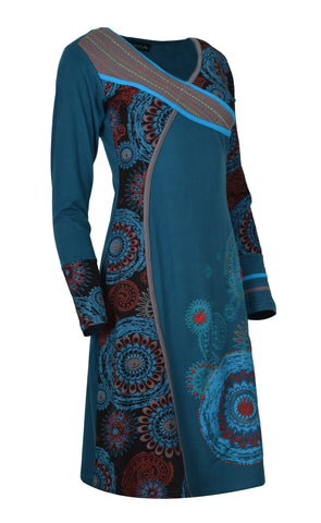 Tattopani women's long sleeve dress with embroidery and floral print design. 100% cotton for comfortable and soft feeling. Uniquely hand sewn embroidery.