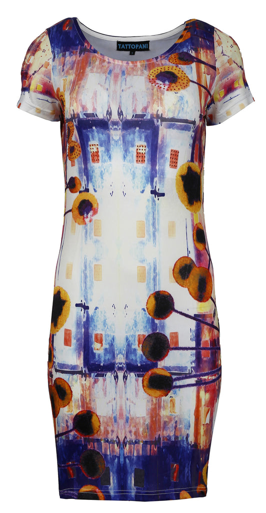 Women's short sleeved dress with muticoloured pattern print